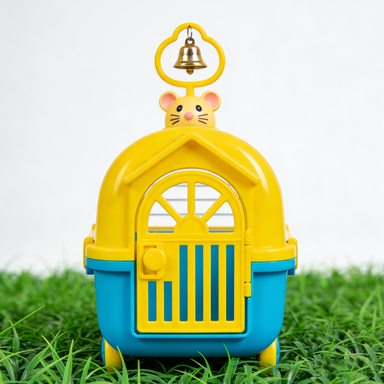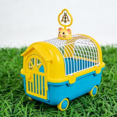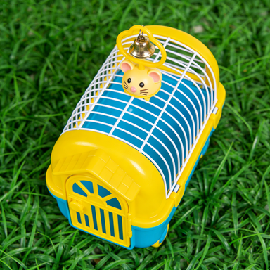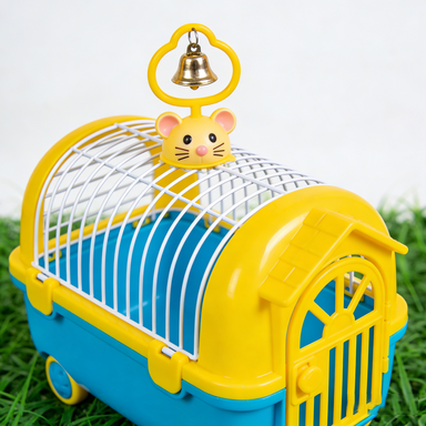 As shown in the blue-yellow pet cage image, specifically designed for small pets, featuring cute mouse head decoration and gold bell. Wholesale price $12-15/unit (based on MOQ), minimum order 100 units, supporting function customization and private labeling.